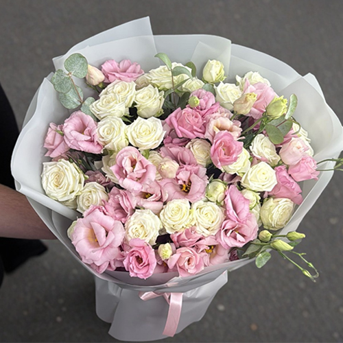 Букет "Мэрилин" из эустом и кустовых пионовидных роз