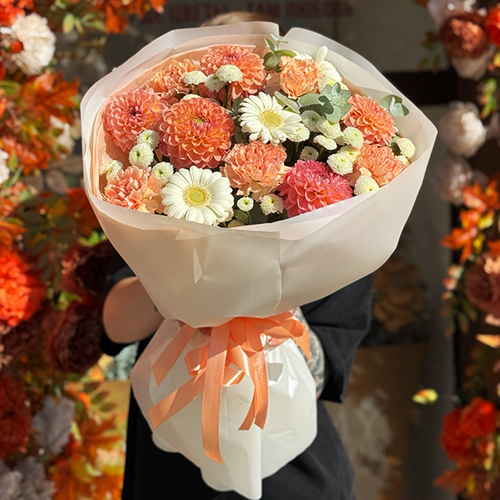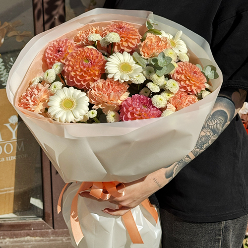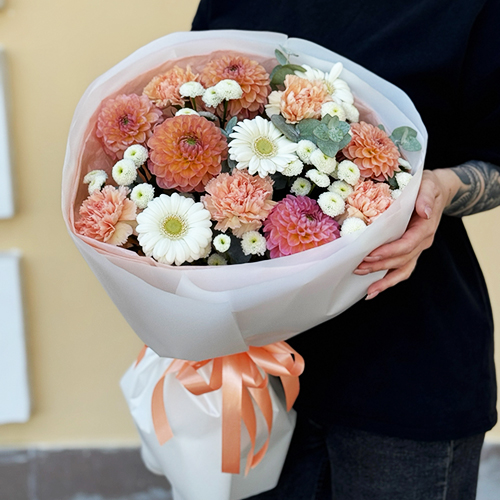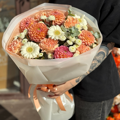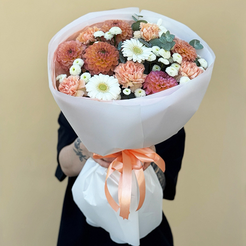 Букет "Персиковый латте" из георгин, диантусов, гербер и хризантем сантини