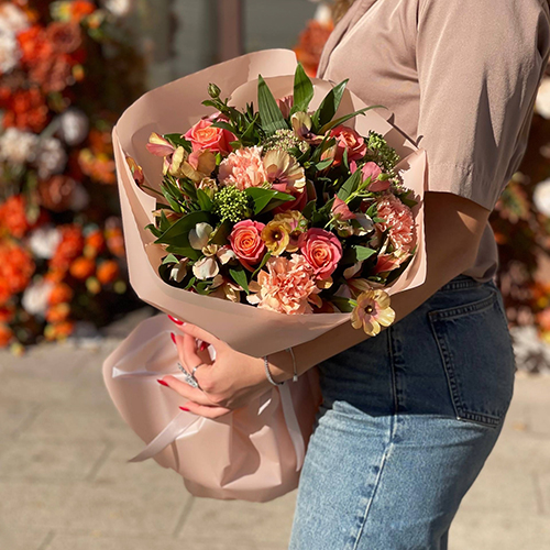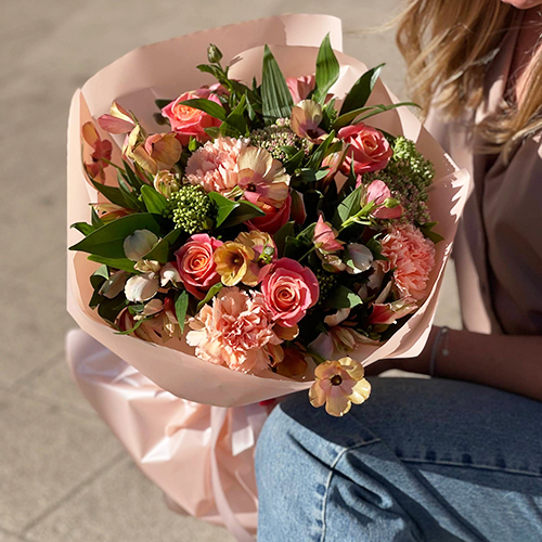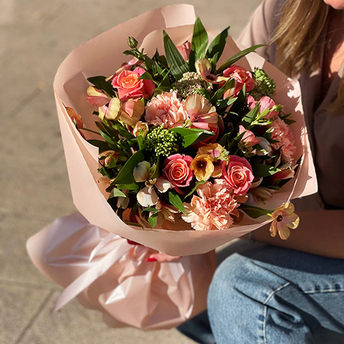 Букет "Каталина" из роз, диантусов, альстромерий, скиммии и кустовых ранункулюсов