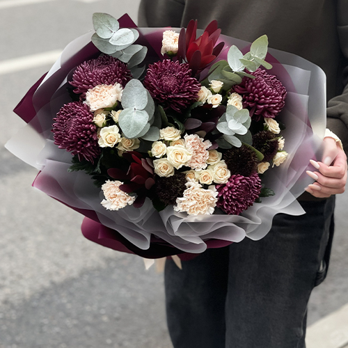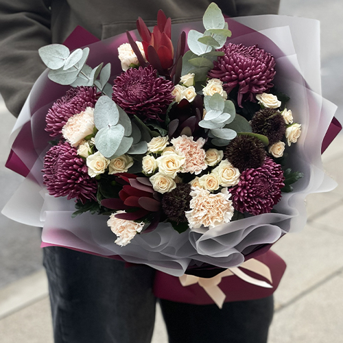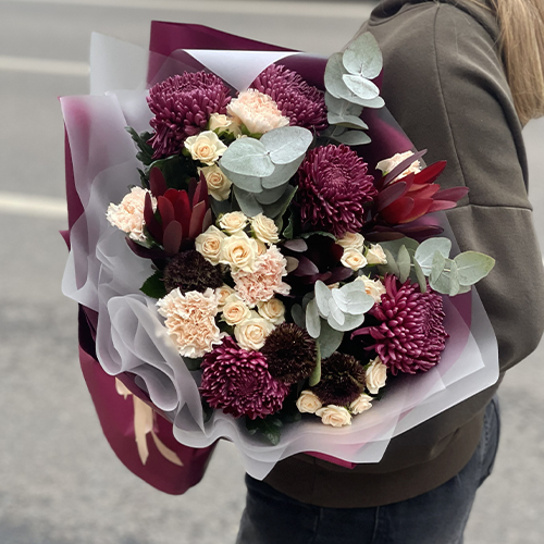 Букет "В каждом мгновении" из хризантем Бигоуди, кустовых роз, сафари, гербер Экзотик и диантусов