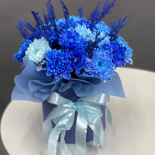 Композиция в шляпной коробке "Магия синего" из хризантем и конифера