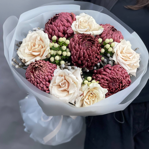 Букет "Всё что тебе касается" из хризантем Бигоуди, роз Эквадор Квиксенд и гиперикума