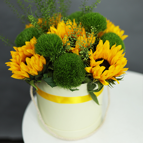 Композиция в шляпной коробке из подсолнухов и диантусов люкс