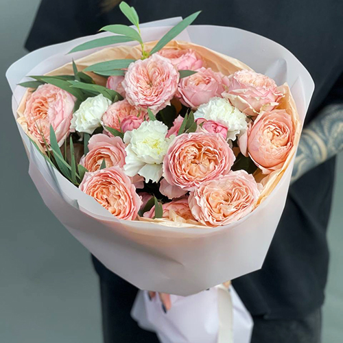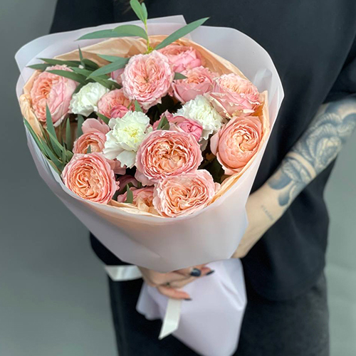Букет "Ласковый миг" из кустовых пионовидных роз Джульетта и диантусов