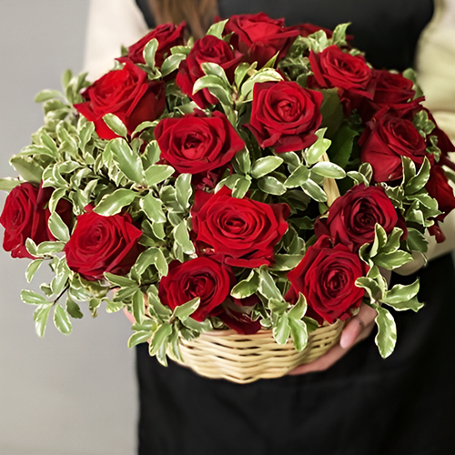 Композиция в корзине "Евгения" из 25 роз и питаспорума