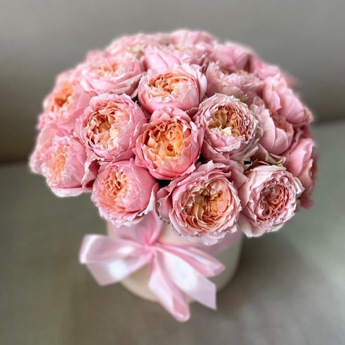 Композиция в шляпной коробке из кустовой пионовидной розы Джульетта