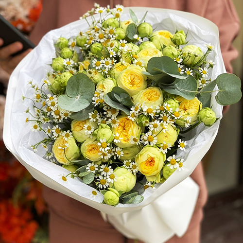 Букет "Иветта" из лимонных пионовидных кустовых роз и ромашек