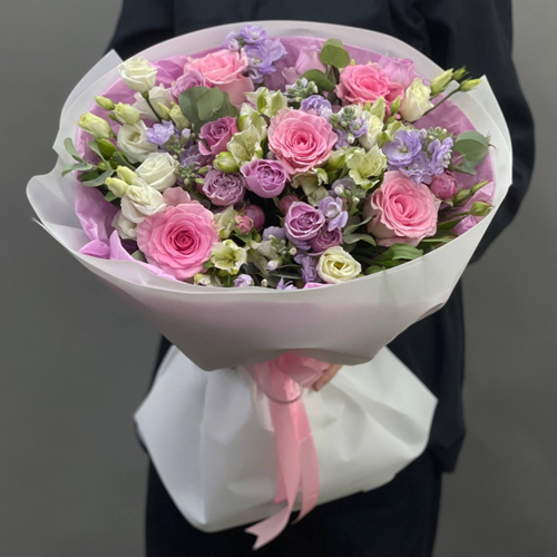 Букет "Хлоя" из альстромерий, кустовых роз, ароматных маттиол, эустом и махровых роз