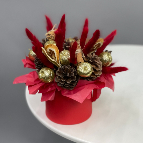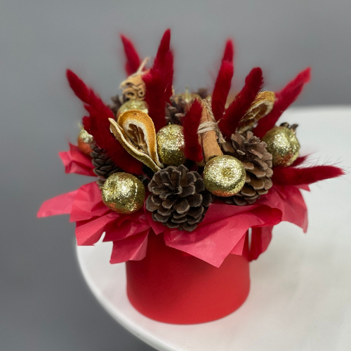 Композиция в шляпной коробке "Глинтвейн золото" из шишек, корицы и лагуруса