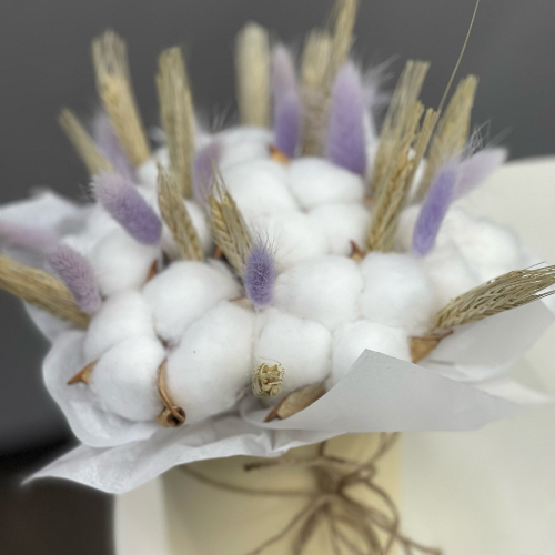 Композиция в шляпной коробке из хлопка, лагуруса и пшеницы (Сухоцвет)